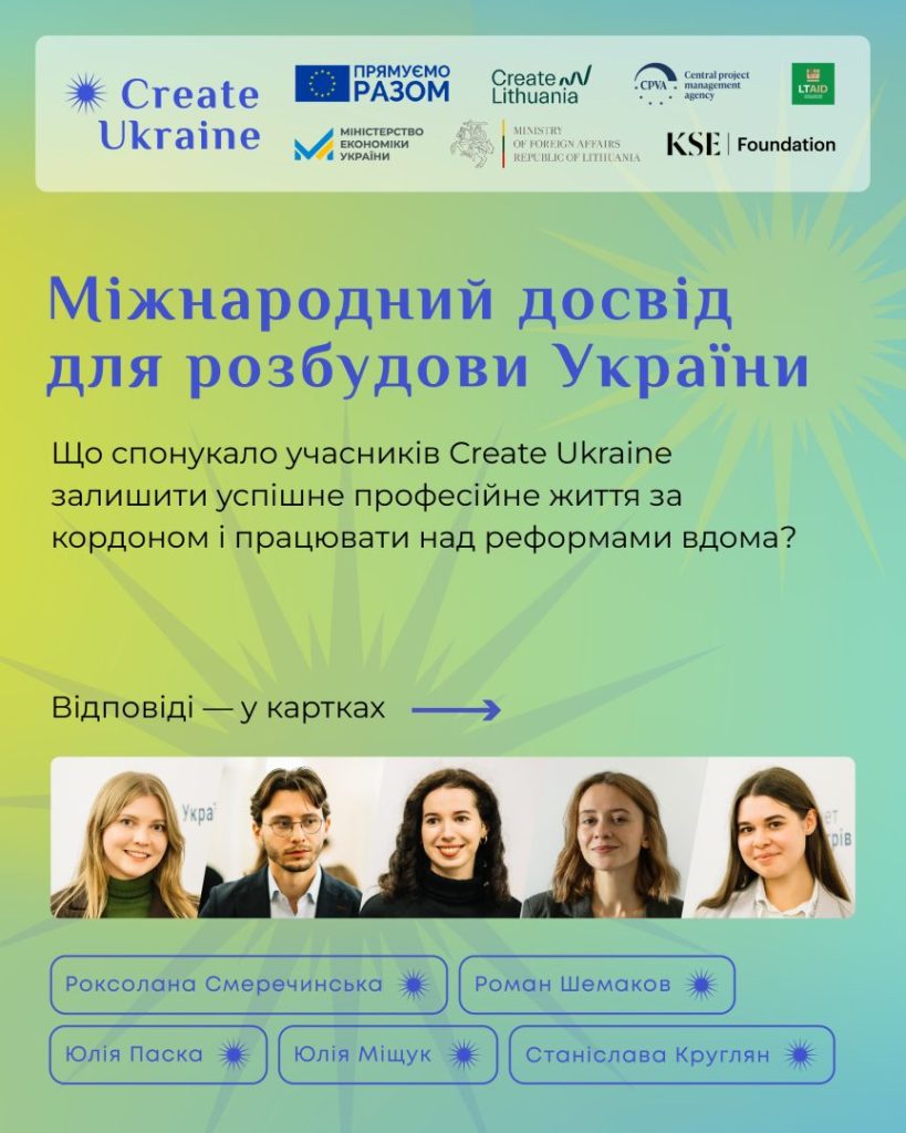 У межах програми Create Ukraine, яку реалізує KSE Foundation за підтримки Central Project Management Agency та за співфінансування ЄС, десять українських фахівців із міжнародним досвідом повернулися з-за кордону, щоб долучитися до урядових проєктів і реформ.